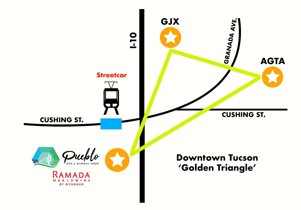 The Pueblo Gem & Mineral Show is hosted annually for over 40 years at the Ramada by Wyndham in centre of downtown Tucson. The Pueblo show is located within the area known as "The Golden Triangle" which is one block away from the AGTA Convention Centre and TGMS Show.